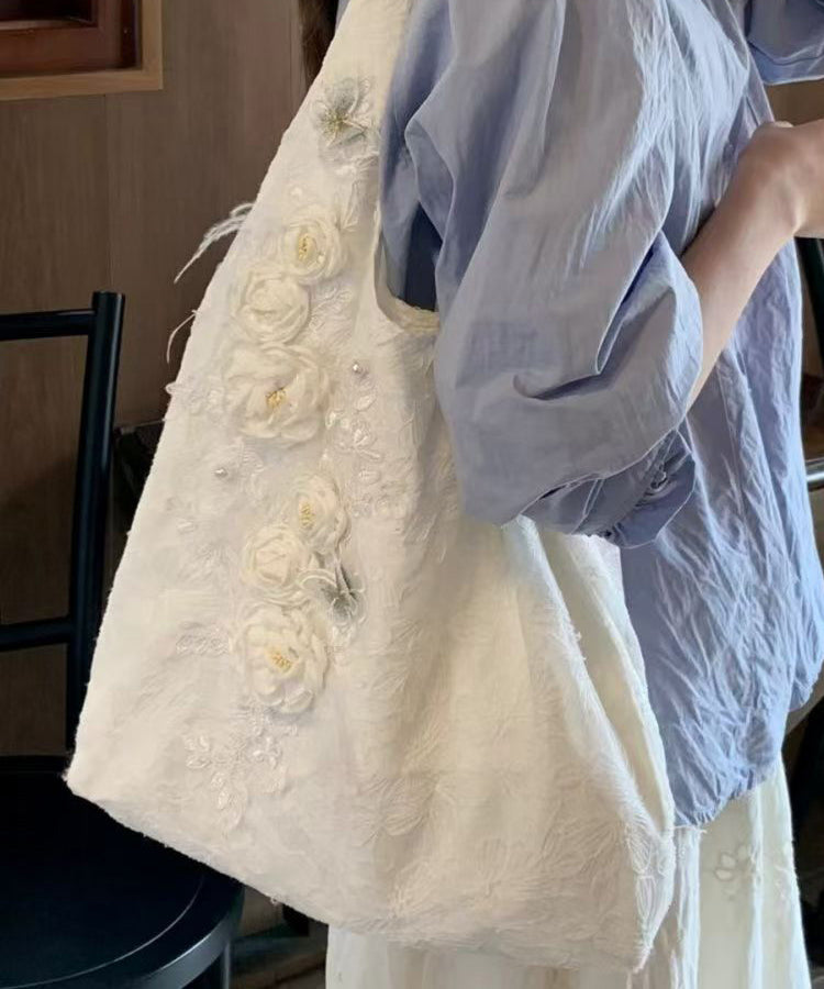Chic White Floral Decorated Canvas Satchel Handbag WI037