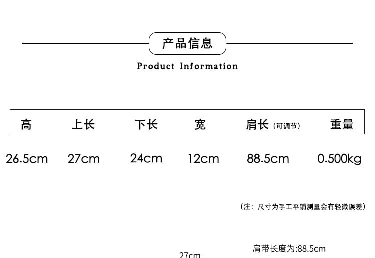 | Height | Upper Length | Bottom Length | Width | Strap Length |