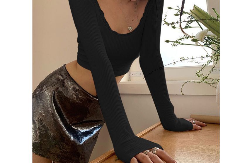 Long-Sleeve Scoop Neck Plain Lace Trim Backless Ribbed Crop Tee