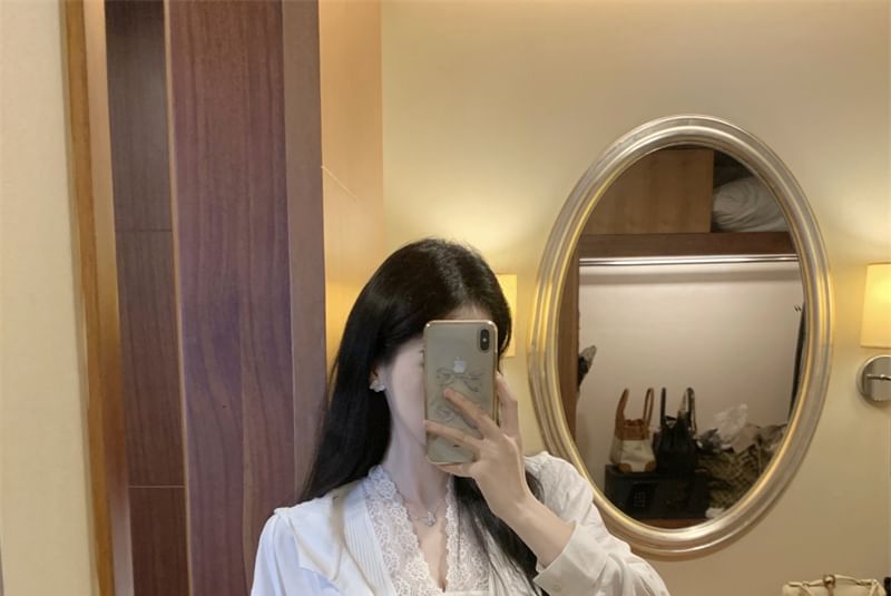 Long Sleeve V-Neck Plain Hooded Top / Sleeveless V-Neck Lace Top / Drawstring Waist Shorts