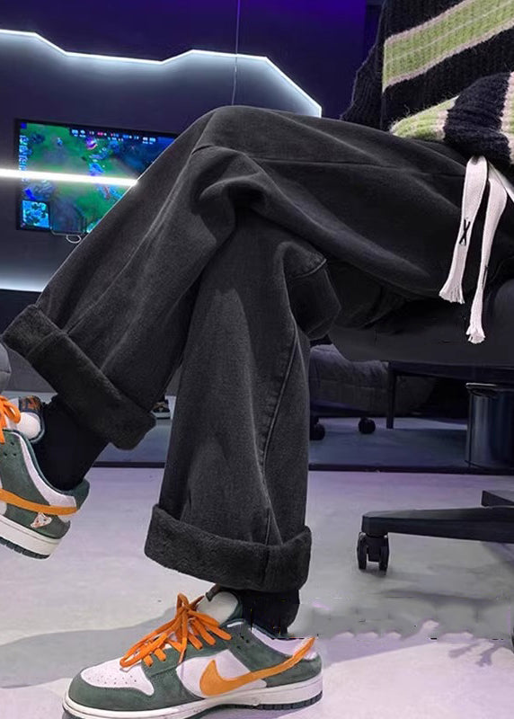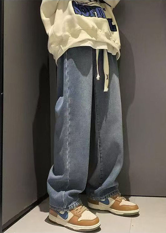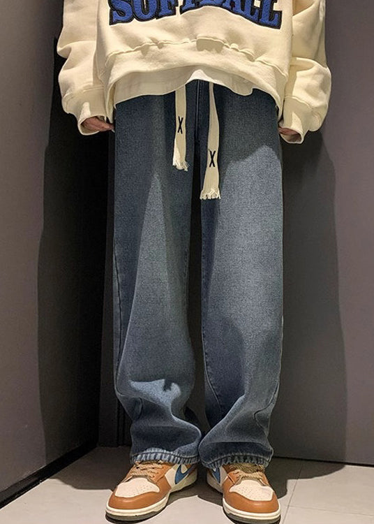 Loose Denim Blue Original Design Elastic Waist Warm Fleece Mens Pants Spring RM029