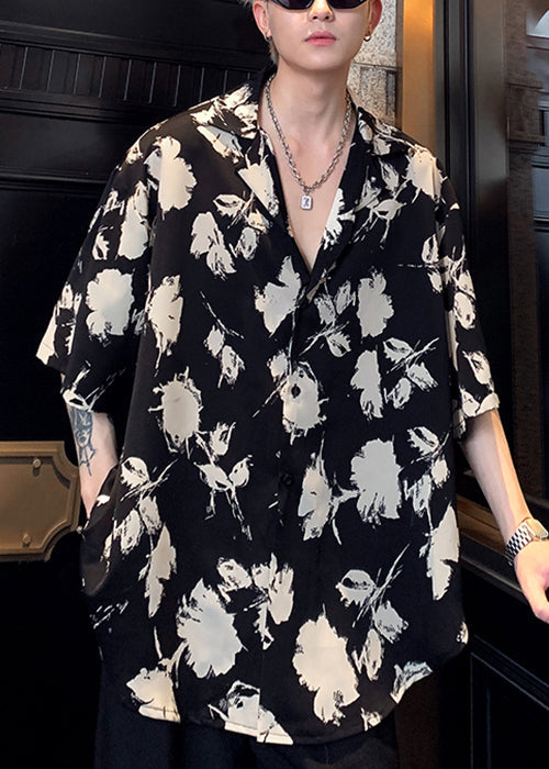 Stylish Black Peter Pan Collar Button Print Cotton Men Shirts Half Sleeve