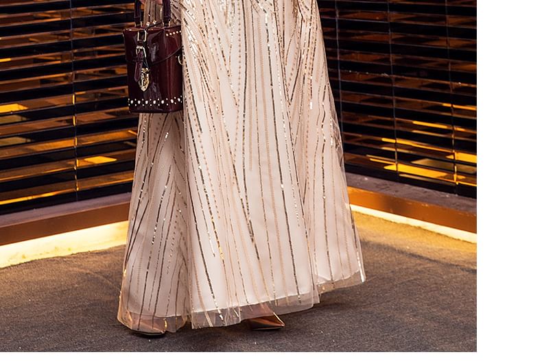 Plus Size Short-Sleeve V-Neck Shiny A-Line Evening Gown