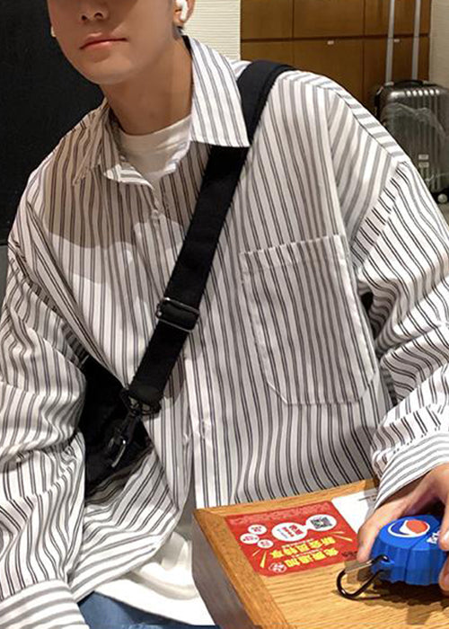 Pockets Collar Striped Mens Cotton White Shirt Pan Peter Spring