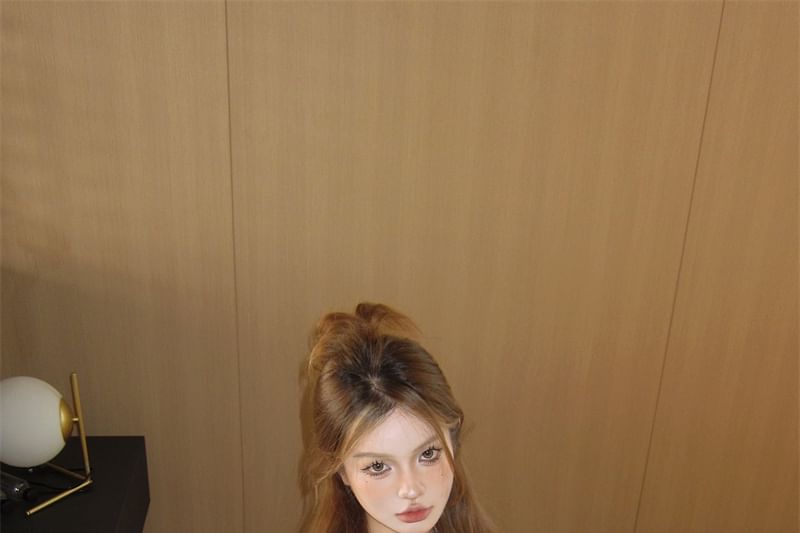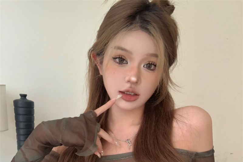 Set: Crop Print Mesh Top + Tube Camo Off-Shoulder Long-Sleeve