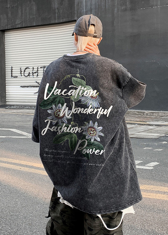 Summer Print T Loose Neck Men Shirt O Grey Cotton