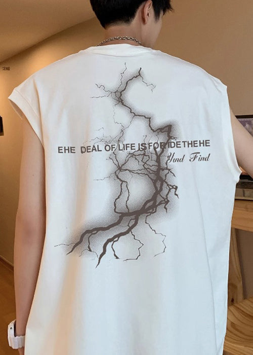 White Men's Print Sleeveless French Oversized Tanks Cotton