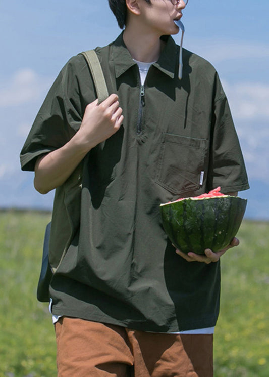 Cotton Summer Shirt Solid Men New Zip Black Up Pockets Polo