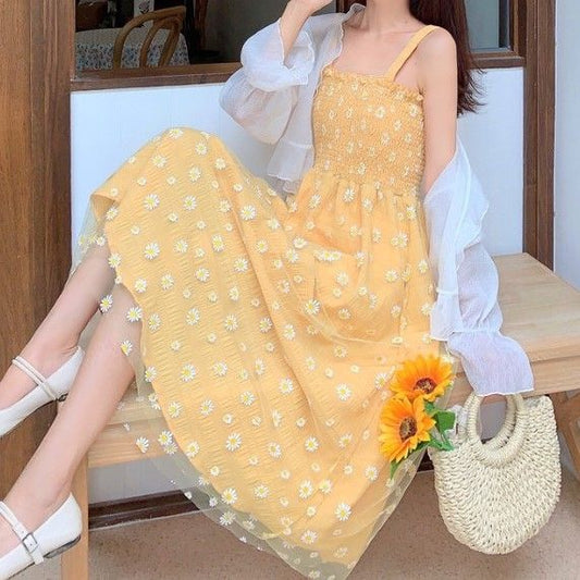 Robe mi-longue à bretelles fleuries avec superposition de maille / cardigan transparent noué sur le devant