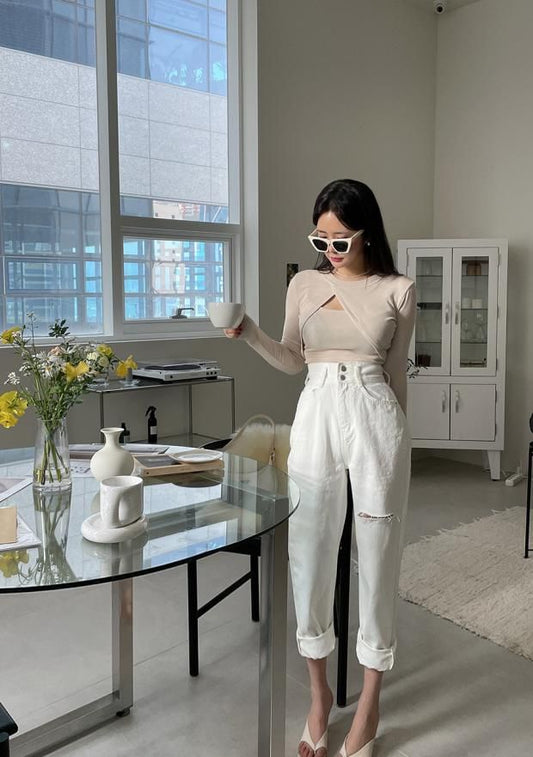 High Waist Plain Ripped Straight Leg Jeans