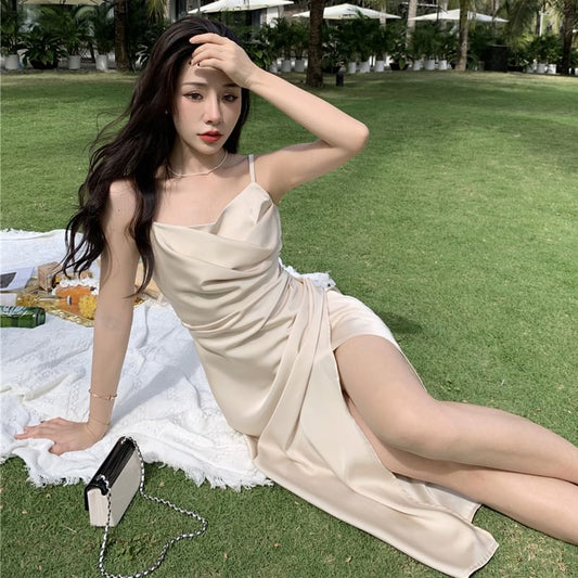 Spaghetti Strap Satin Shirred Wrap Midi Bodycon Dress