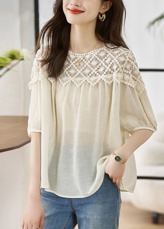 Women Khaki O Neck Lace Patchwork Cotton Top Lantern Sleeve TH033