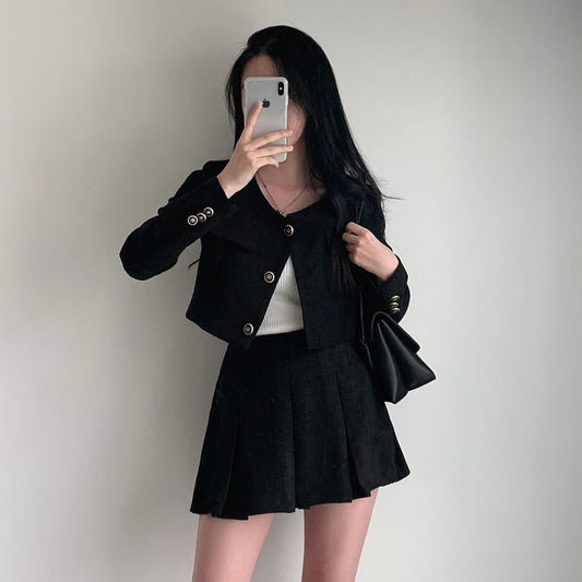 Round Neck Plain Crop Button Jacket / High Rise Pleated Mini A-Line Skirt