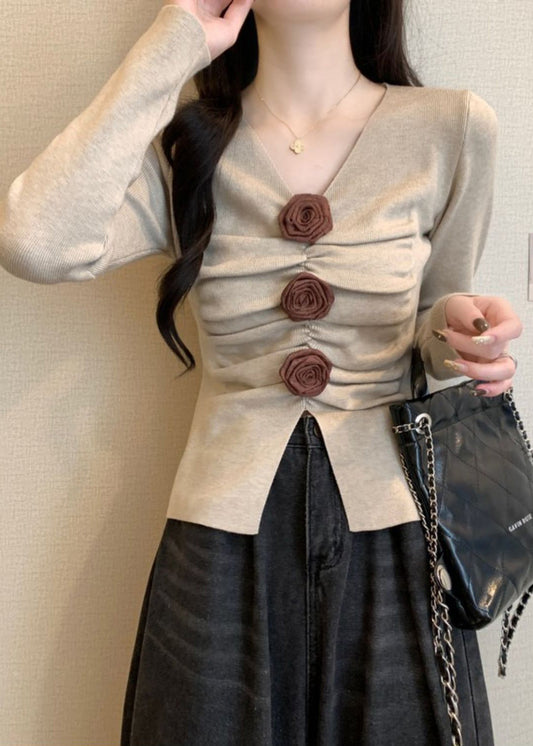 Silm Fit White V Neck Floral Knit Sweater Spring TM030