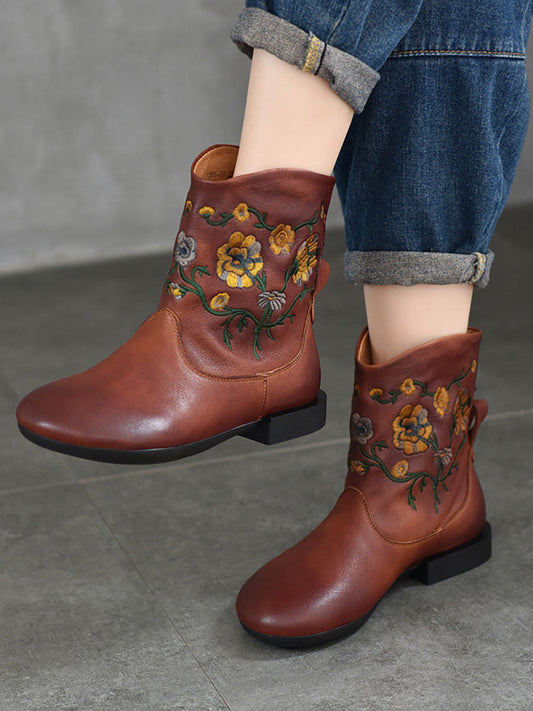 Women Vintage Flower Embroidery Leather Low Heel Boots AX1050