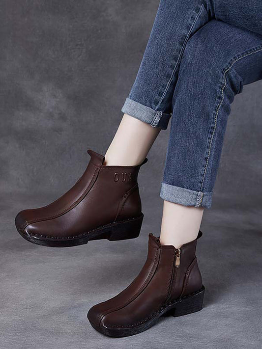 Women Retro Genuine Leather Zippper Mid-Heel Boots