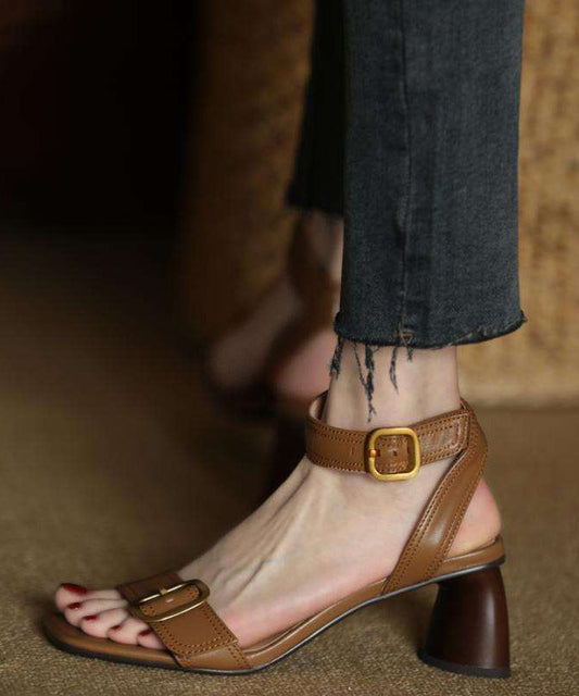 Brown Cowhide Leather Out Hollow Sandals Splicing Flat Breathable