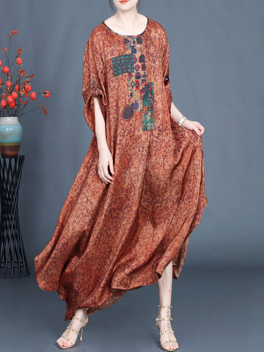 Robe longue ample en soie à col rond et imprimé rouge vin à manches mi-longues OP1018