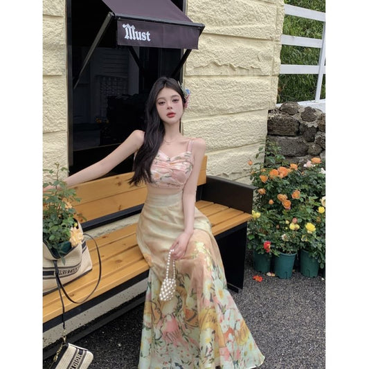 Set: Floral Cropped Cami Top + High Rise Maxi A-Line Skirt