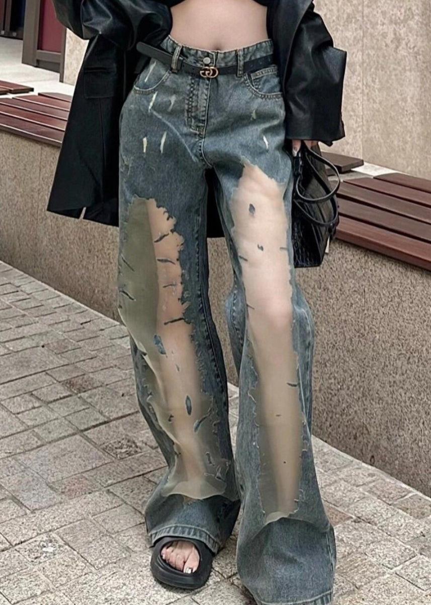 Chic Blue Hollow Out Patchwork Tulle Denim Straight Pants Spring YK032