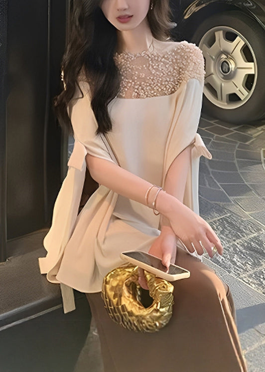 Chiffon Top Sleeved Pearl Handmade Apricot Patchwork Half Bow