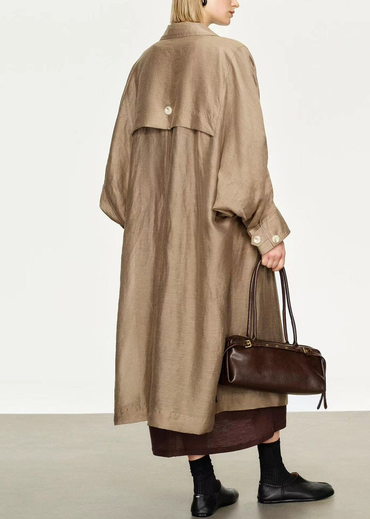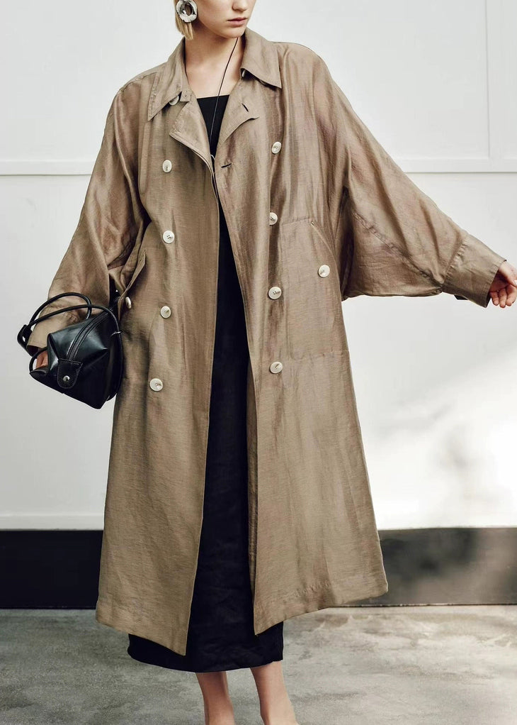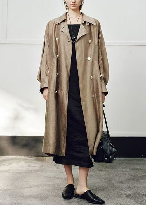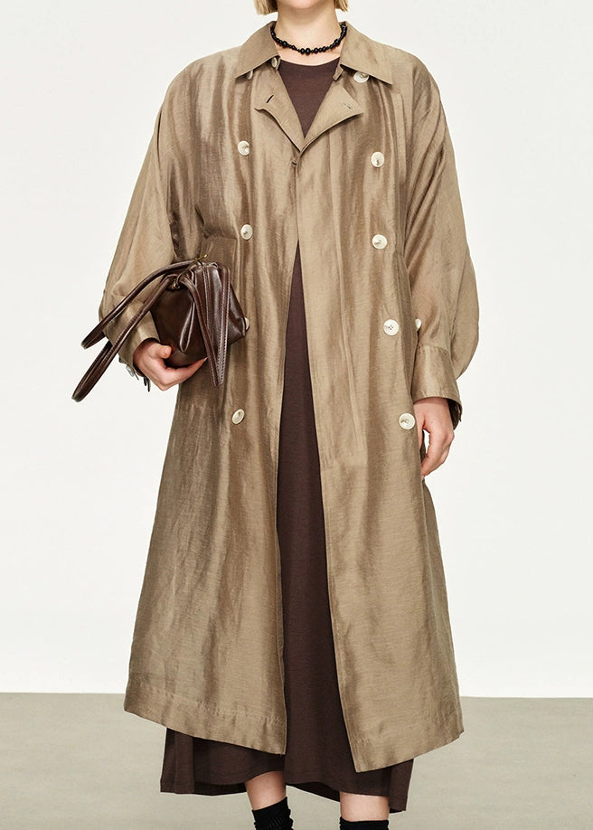 Loose Champagne Gold Peter Pan Collar Double Breast Linen Silk Long Trench Coat Fall