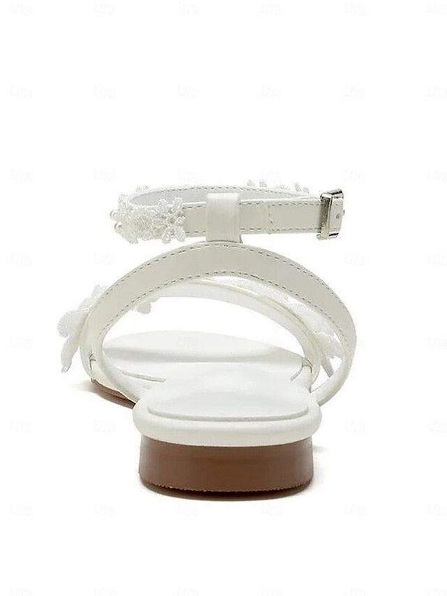 Floral Sandals White with Ankle Lace Open-Toe Flats Block Straps