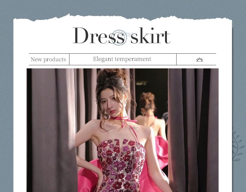 Floral Sequin Bow Back Trained Slit Mermaid Tube Evening Gown