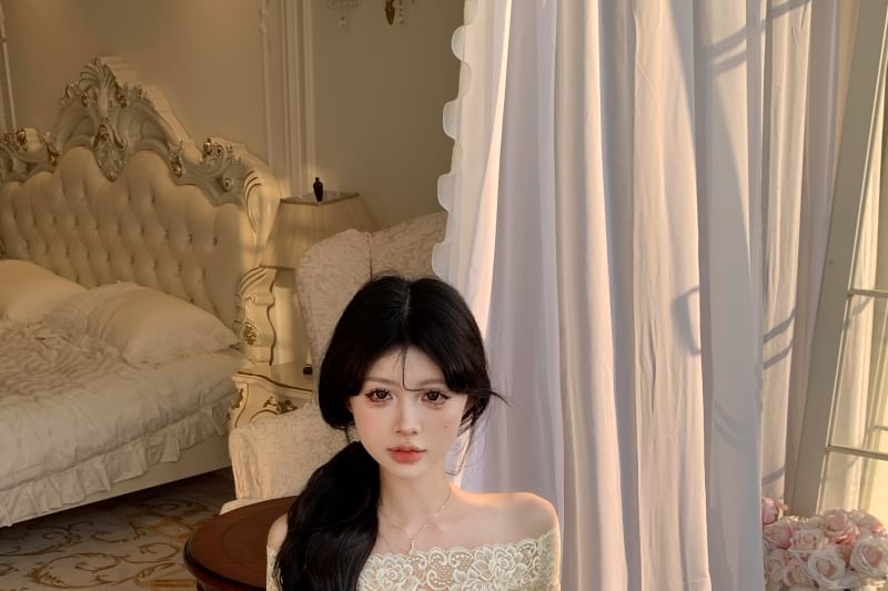 Short-Sleeve Off-Shoulder Plain Lace Trim Tee / High Rise Floral Mini Pencil Skirt
