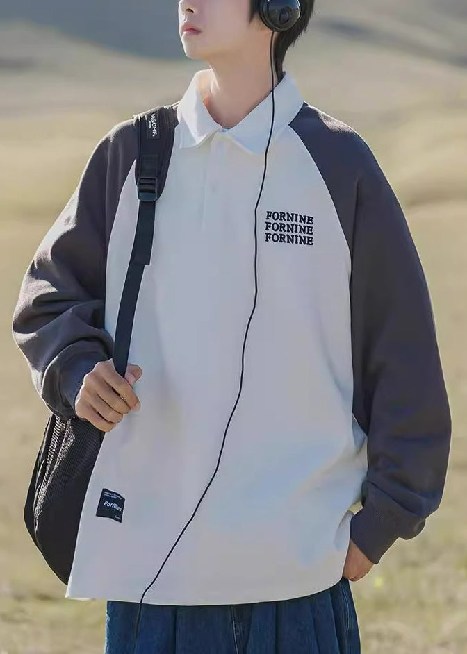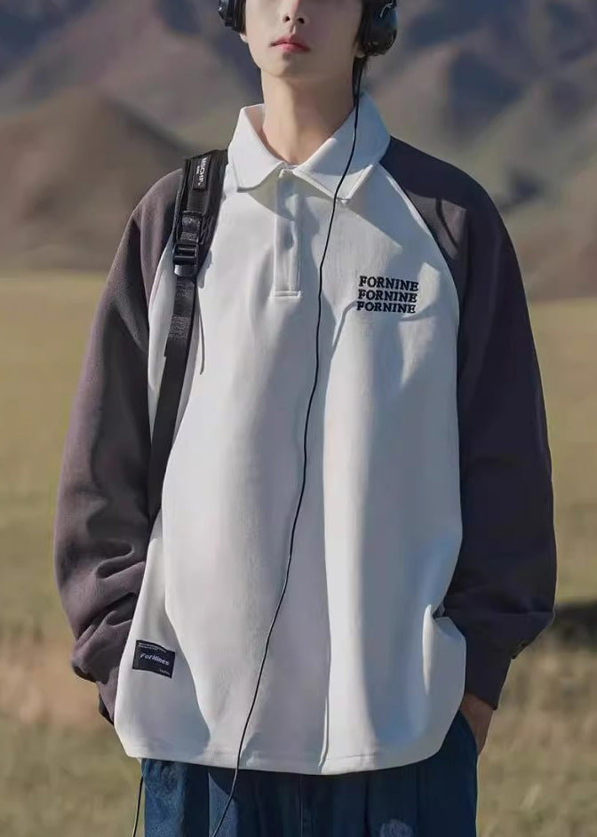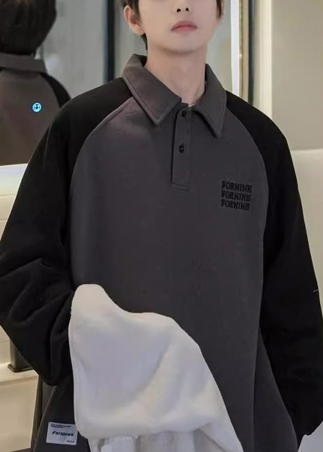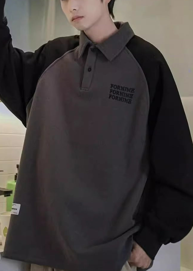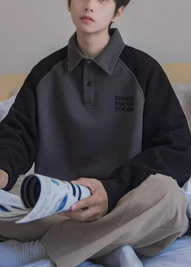 Loose Dark Gray Print Button Patchwork Cotton Men Sweatshirt Spring TC016