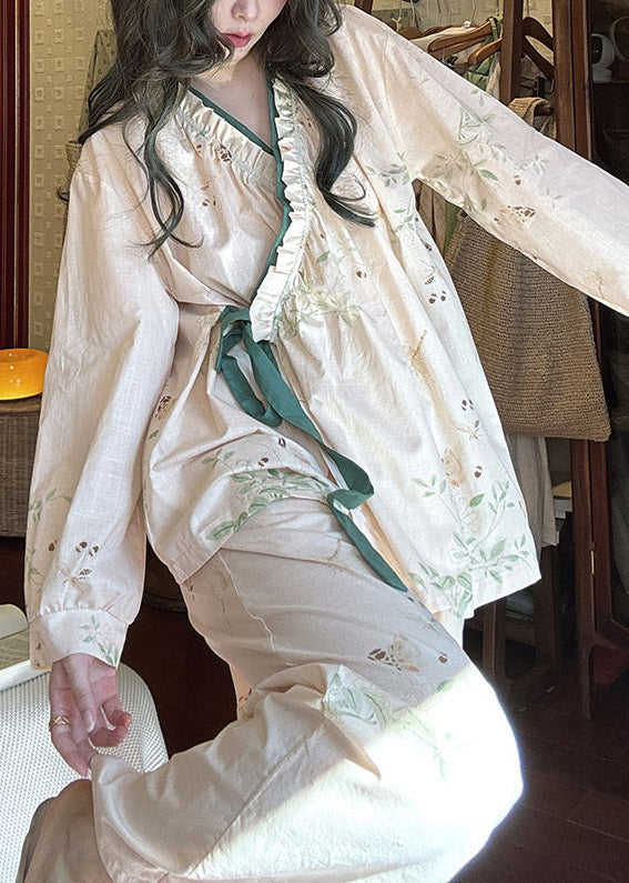 Loose Apricot Ruffled Print Lace Up Cotton Pajamas Two Pieces Set Fall