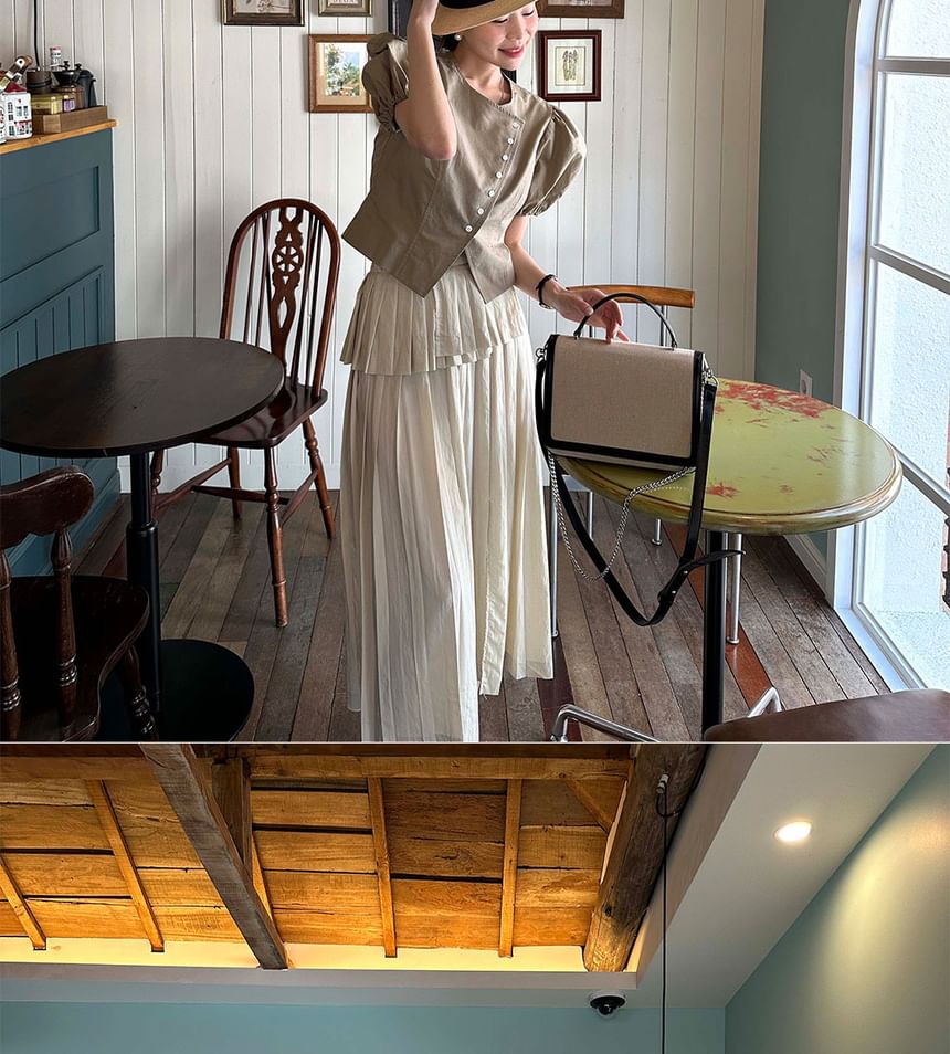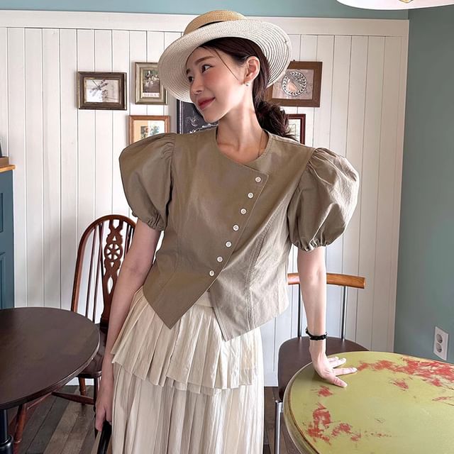 Puff-Sleeve Round Neck Plain Asymmetrical Blouse / High Rise Slit Pleated Midi A-Line Skirt