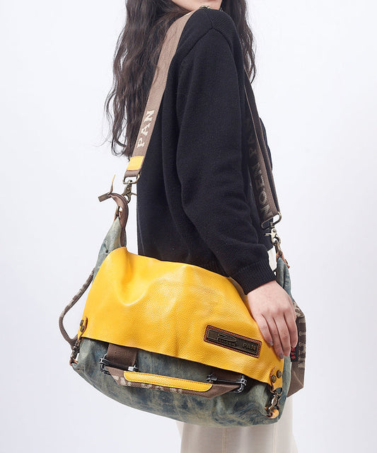 Sac messager en cuir de veau patchwork en coton imprimé jaune pour femme ZX1053
