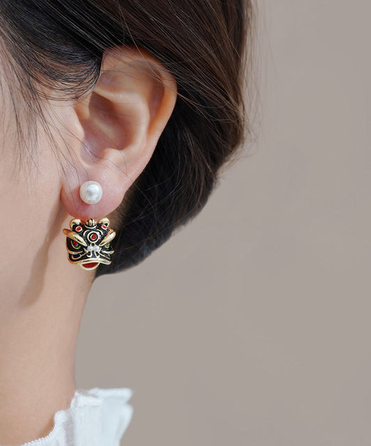 Original Design Gold Sterling Silver Overgild Pearl Lion Head Stud Earrings RA024