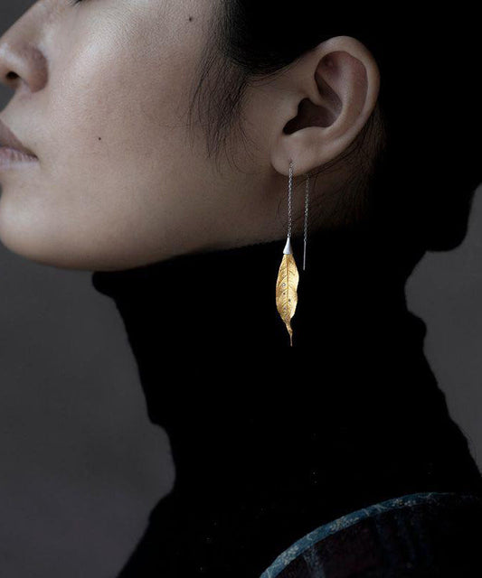 Boucles d'oreilles pendantes simples en argent sterling doré avec feuille QQ071