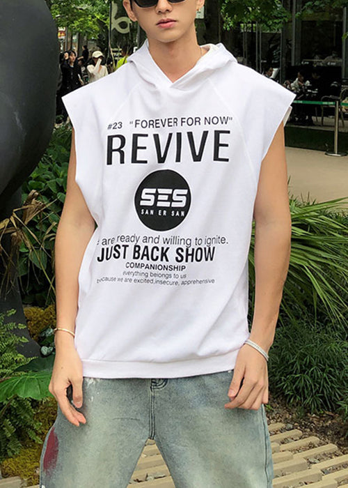 Cotton Mens Sleeveless Hooded Letter Loose Tanks Khaki