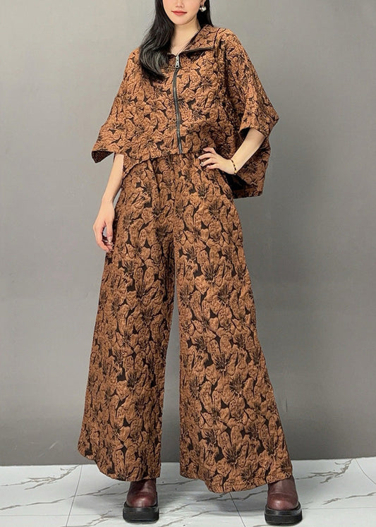 Bohemian Chocolate Print Zippered Top And Wide Leg Pants Two Piece Set Fall