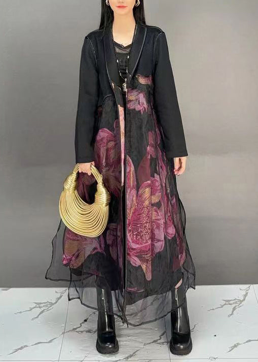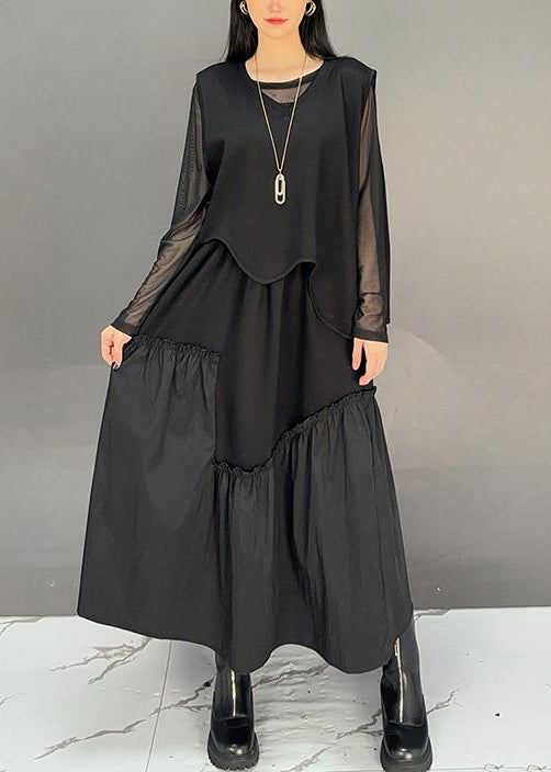 Loose Black O-Neck Ruffled Patchwork Cotton Long Dresses Fall