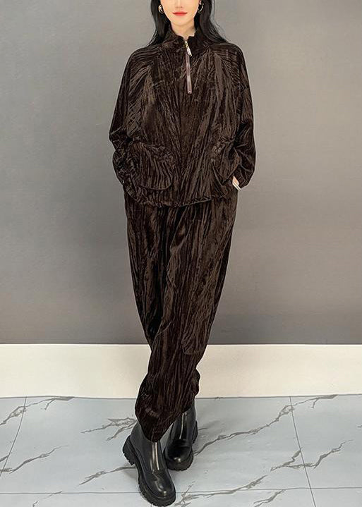 Loose Brown Zippered Tops And Crop Pants Silk Velvet Two Pieces Set Winter