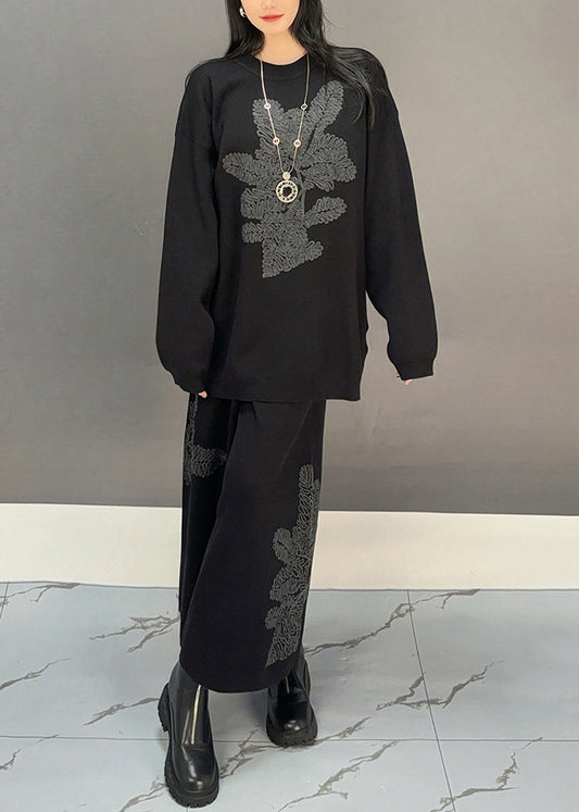 Simple Black O Neck Embroidered Solid Cotton Two Piece Set Fall