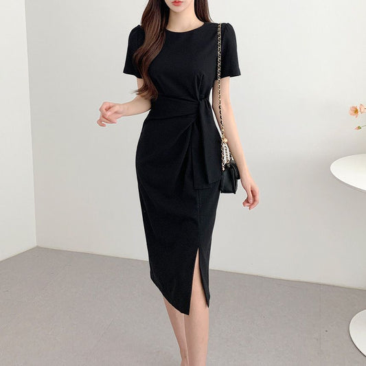 Short-Sleeve Crewneck Sashed Plain Midi Sheath Dress