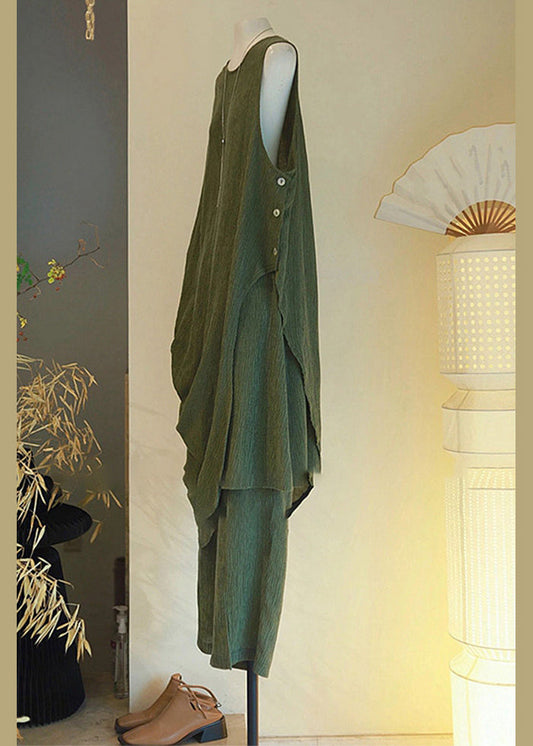 Pieces Button Green Cotton Asymmetrical Women Sleeveless Two Set
