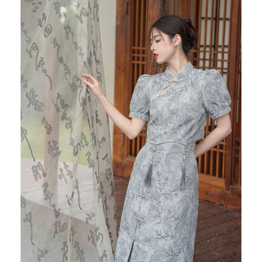 Long-Sleeve Band Collar Floral Hanfu Blouse / Spaghetti Strap V-Neck Plain Midi A-Line Dress / Set