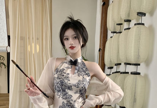 Halter Neck Floral Midi Qipao / Shrug / Set