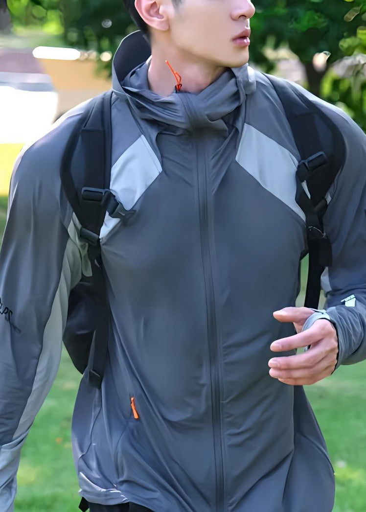 New Grey Hooded Zippered Patchwork Ice Silk Mens UPF 50+ Coat Summer