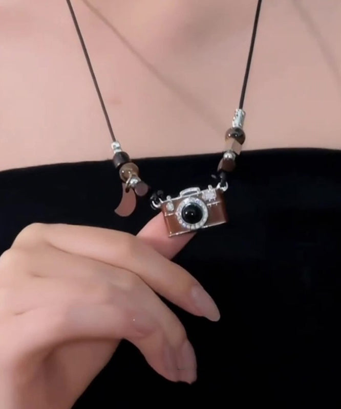 Retro Brown Copper Overgild Leather Resin Drip Glaze Camera Pendant Necklace