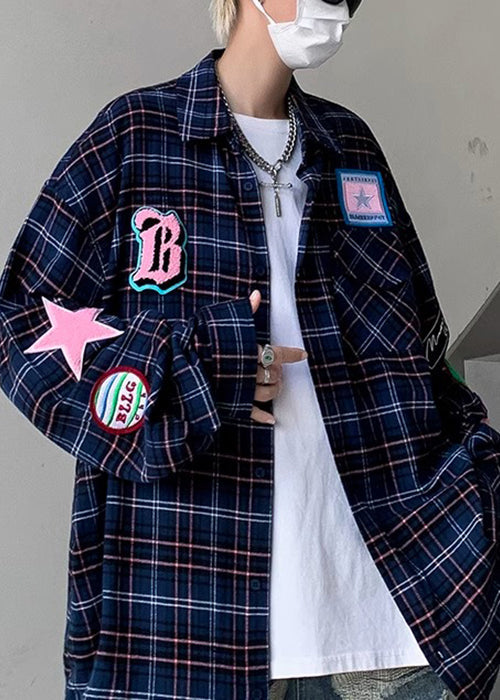 French Navy Plaid Pockets Cotton Shirt Men Spring