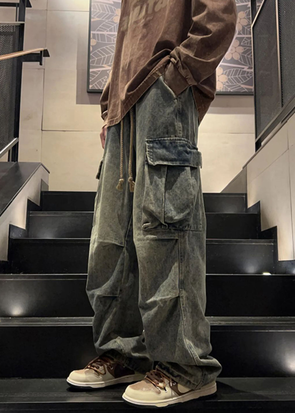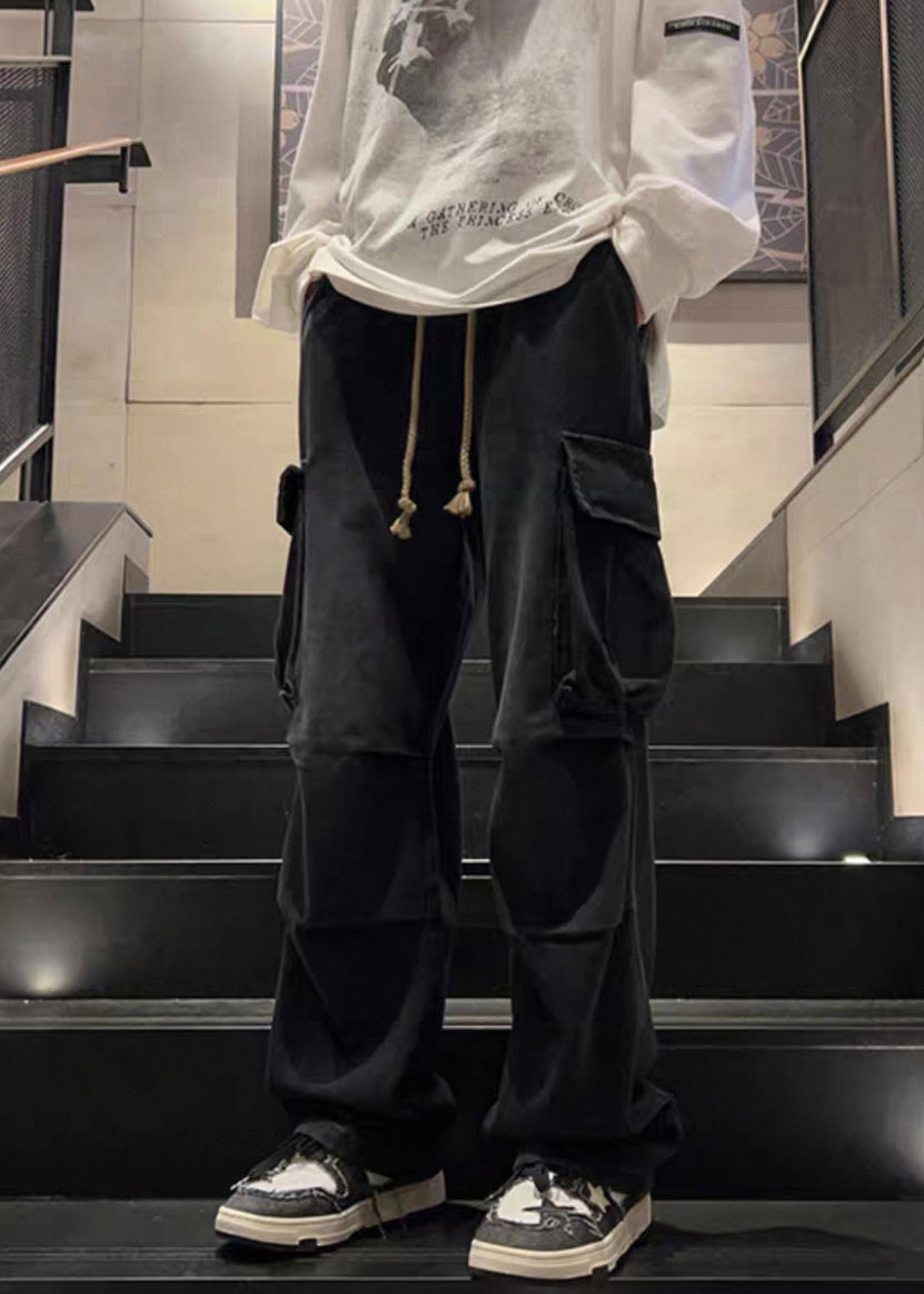New Denim Blue Wrinkled Pockets Elastic Waist Mens Pants Spring