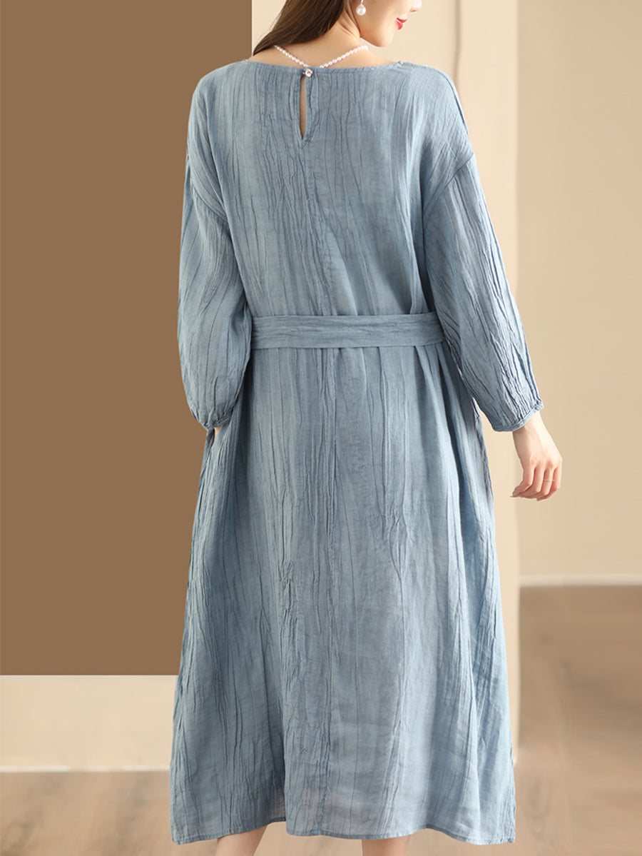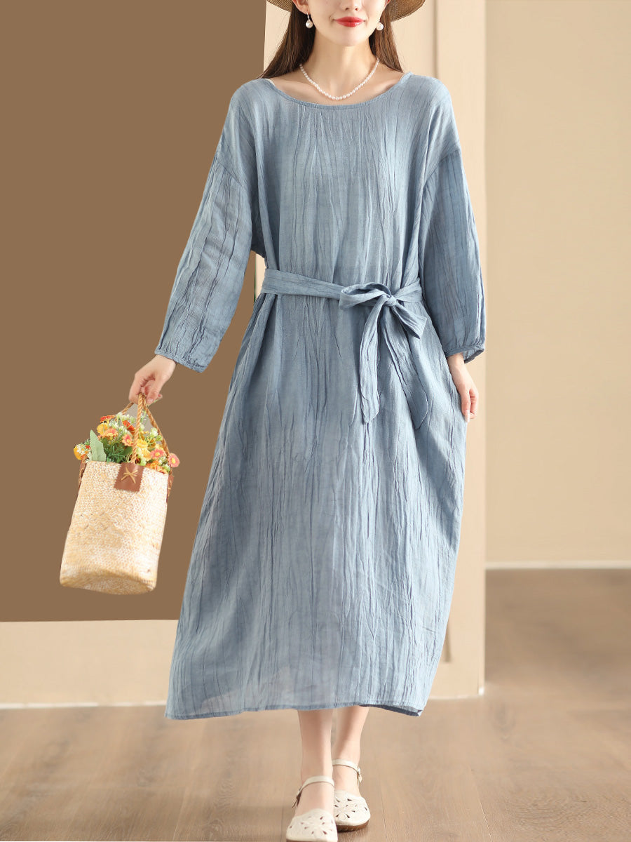 Magnifiquement confectionnée à partir d'un luxueux mélange de ramie et de lyocell, cette robe exquise présente un motif uni intemporel et des manches raglan élégantes, garantissant à la fois style et confort. Avec un col rond raffiné et des manches gracieuses jusqu'aux chevilles, elle est parfaitement adaptée à la saison estivale.