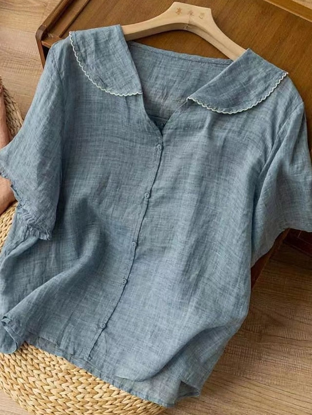 Fabric: Cotton Linen, Tops Type: Cotton Linen Shirts, Gender: Women's, Design: Buttons, Occasion: Daily, Style: Basic, Casual, Category: Blouse, Fit Type: Regular Fit, Neckline: Shirt Collar, Sleeve Length: Short Sleeve, Elasticity: Micro-elastic, Look After Me: Hand wash, Machine wash, Top Length: Regular Tops, Pattern: Solid Color, Season: Spring, Summer,